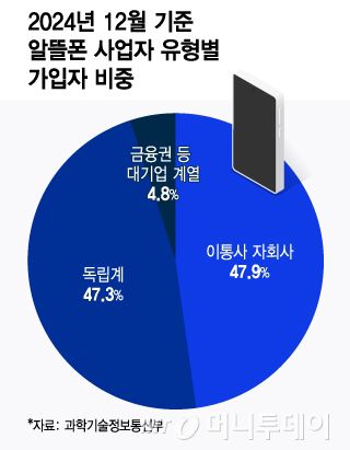 29일 머니투데이가 이훈기 더불어민주당 의원실을 통해 과기정통부로부터 받은 '2024년 알뜰폰 사업자 현황'에 따르면 지난해 12월 기준 알뜰폰 가입자는 총 949만명이다. 이중 △이통3사 자회사(5개)가 47.9% △대기업·금융권(2개)이 4.8% △독립계(중소·중견, 47개)가 47.3%를 차지했다.