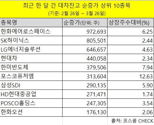 30일 코스콤 CHECK에 따르면 지난 한 달간 (2월 26일 ~ 3월 26일) 대차잔고가 가장 많이 순증가한 종목은 한화에어로스페이스였다. 상장주수 대비 대차잔고 비율은 6.25% 수준이었다.