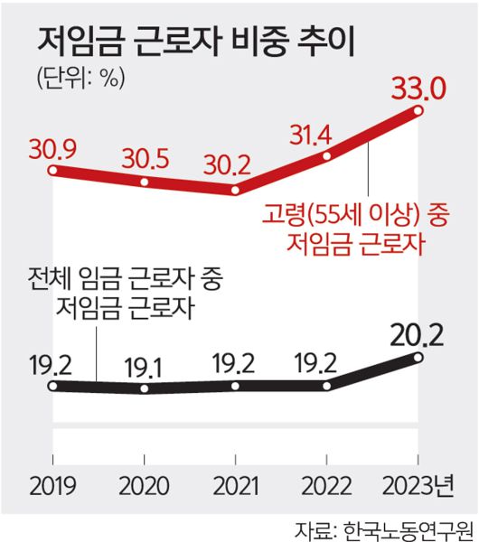 30일 한국노동연구원이 발간한 ‘고령 저소득 노동 실태와 정책 대응’ 보고서를 보면 2023년 저임금 근로자 비중은 20.2%로 2013년(26.3%) 대비 줄었다. 같은 기간 55세 임금 근로자 중 저임금 근로자 비중은 40.6%에서 33.0%로 낮아졌다. 그러나 고령 근로자 중 저임금 비율은 여전히 높고, 전체 근로자와 비교해서도 높은 편이다.