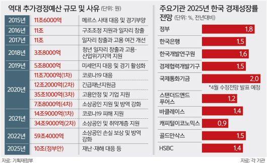 글로벌투자은행(IB)들도 우리나라의 올해 경제성장률을 속속 하향 조정하고 있다. 특히 0%대 성장이라는 충격적인 전망도 나왔다. 정부가 추경의 콘셉트를 ‘산불’이 아닌 대내외 악재에 대응하는 ‘필수’로 확장한 이유다. 추경을 통해 경기를 끌어올릴 수는 없더라도 떨어지는 폭을 낮추는 ‘버팀목’ 역할을 하겠다는 전략이다.