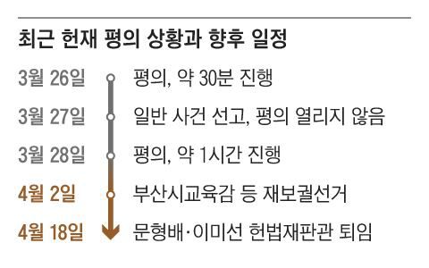 헌재가 아무리 늦더라도 문형배 헌재 소장 권한대행과 이미선 재판관의 퇴임이 예정된 내달 18일 이전에는 윤 대통령 사건 결론을 낼 것이란 게 법조계의 대체적 전망이다. 두 재판관이 퇴임하면 헌재는 ‘6인 체제’가 돼 사실상 기능 마비에 빠질 수 있다. 헌재가 ‘4·2 재보궐선거’ 이전에 윤 대통령 탄핵 사건을 선고할 가능성도 낮다. 헌재 선고 내용이 선거에 영향을 줄 수 있기 때문이다. 노무현·박근혜 전 대통령 탄핵 사건 모두 금요일에 선고한 것을 감안하면, 헌재가 내달 4일 또는 11일에 윤 대통령 파면 여부를 선고할 것이라는 전망이 나온다.
