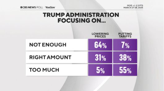 CBS와 여론조사 기관 유고브가 지난 27~28일 2609명의 미국 성인을 대상으로 실시해 이날 공개한 여론조사(오차범위 ±2.3%)에 따르면 트럼프 대통령이 관세 문제에 지나치게 집중하고 있다는 응답자는 55%에 달했다. 전체 응답자의 64%는 트럼프 대통령이 인플레이션과 관련해서는 ‘충분히 집중하고 있지 않다’고 답했다.