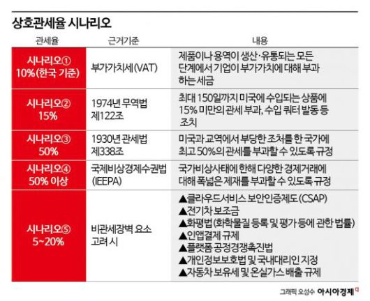 전문가들은 다양한 관세 시나리오를 제기한다. 미국이 조만간 발표할 수 있는 ‘더티 15(Dirty 15)’ 명단에 한국이 포함될 가능성이 크다고 보고 있기 때문이다. 특히 부가가치세를 기준으로 매기는 관세 방식이 가장 유력한 시나리오가 될 전망이다. 한국의 부가가치세율은 10%로, 미국의 평균 판매세율(6.6%)보다 높은 편이다. 이에 따른 상호관세 수준은 10~20% 선에서 책정될 가능성이 높다. 주 실장은 "상호관세는 부가세 기준을 준용할 가능성이 크며, 한국은 10% 유럽은 20% 수준이 될 수 있다"고 내다봤다.