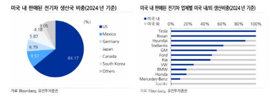 2024년 기준 미국 전기차 판매의 64%는 미국 내에서 조립된 반면, 내연기관차는 약 48%만이 자국 내에서 조립됐다. 전기차 판매 상위 업체 중 테슬라(Tesla), 리비안(Rivian)은 100% 미국에서 조립하기 때문에 관세 영향이 낮은 편이다. 현대차(005380)(87.6%), 스텔란티스(Stellantis)(61.7%), GM(53.9%), 포드(Ford)(48.3%) 순으로 미국 생산 비중이 높다. 반면 유럽 업체들은 미국 전기차 생산 비중이 10~20%대에 불과해, 관세가 지속되면 미국으로 전기차 생산 기지를 이전할 가능성이 높다.
