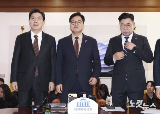 우원식 국회의장(가운데)과 국민의힘 권성동 원내대표(왼쪽), 더불어민주당 박찬대 원내대표가 31일 오전 국회 의장실에서 열린 의장 주재 여야 원내대표 회동에서 기념촬영을 하고 있다.