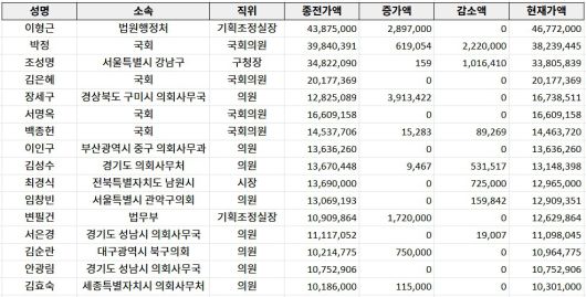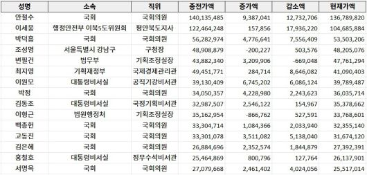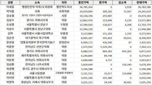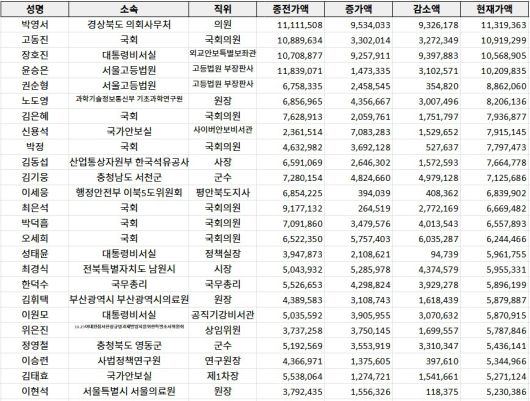 2025년 고위공직자 재산공개 대상자 중 보유한 건물의 자산가치가 가장 높은 공직자는 이형근 법원행정처 기획조정실장(467억 원)으로 나타났다. 이어 박정 국회의원(382억 원), 조성명 강남구청장(338억 원) 순이었다. 가장 큰 증가액을 기록한 공직자는 정점식 국민의힘 의원으로 60억 원이 증가했다. 정 의원은 2025년 건물 현재가액 신고액은 80억 8천만 원이다.