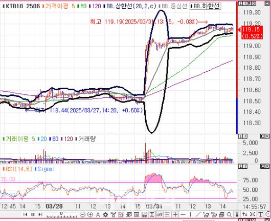10년 국채선물의 경우 장 중 볼린저밴드(BB) 상단을 돌파할 정도로 장 초부터 강한 매수세가 나왔다. 가격은 반빅(50틱) 넘게 상승 중이다.