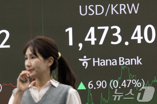 모든 상장 종목의 공매도가 전면 재개된 31일 서울 중구 하나은행 본점 딜링룸 전광판에 달러·원 환율이 전 거래일 대비 6.90원 오른 1,473.40원을 나타내고 있다. 이날 코스피 지수는 전 거래일 대비 76.86p(3.00%) 하락한 2,481.12, 코스닥 지수는 20.91p(3.01%) 하락한 672.85으로 장을 마감했다. 2025.3.31/뉴스1 ⓒ News1 이승배 기자 |
