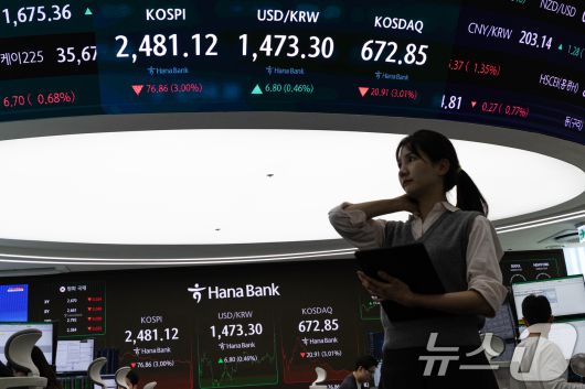 모든 상장 종목의 공매도가 전면 재개된 31일 서울 중구 하나은행 본점 딜링룸 전광판에 종가 현황이 표시돼 있다. 이날 코스피 지수는 전 거래일 대비 76.86p(3.00%) 하락한 2,481.12, 코스닥 지수는 20.91p(3.01%) 하락한 672.85으로 장을 마감했다. 2025.3.31/뉴스1 ⓒ News1 이승배 기자 |