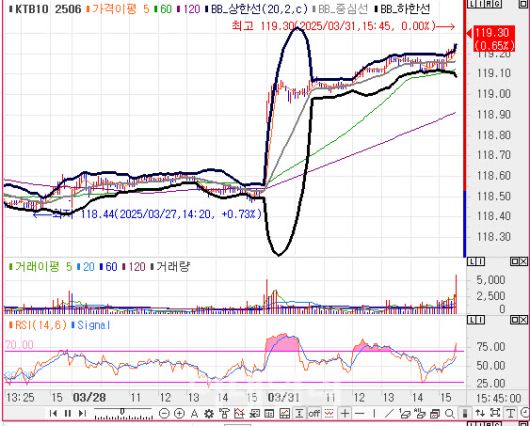 10년 국채선물 가격 5분봉 차트(자료=엠피닥터) |
