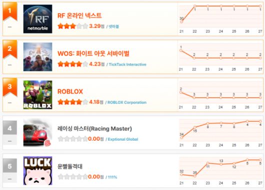 'WOS: 화이트 아웃 서바이벌'과 '로블록스'가 2위와 3위를 유지하고 있는 가운데, 넷이즈의 신작 '레이싱 마스터'가 4위로 또 한번 점프했다. 공식 라이선스를 획득한 100종 이상의 명차를 커스터마이즈하고, 전 세계의 명소들을 실시간으로 질주하는 '레이싱 마스터'는 비RPG 장르임에도 의외로 선전하고 있다. 다음주 순위가 기대된다.
