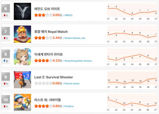화제를 모으고 있는 두 작품 '레전드 오브 이미르'와 '이세계 판타지 라이프'는 각각 6위와 8위로 조금씩 오르내렸다.
