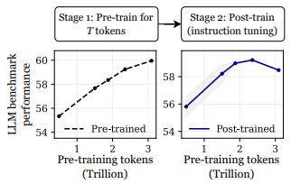 그 결과, 3조 토큰 모델은 '지시 튜닝(instruction tuning)' 후 여러 LLM 벤치마크에서 2% 이상 낮은 성능을 보였으며, 일부 평가에서는 성능 저하가 3%에 달했다.