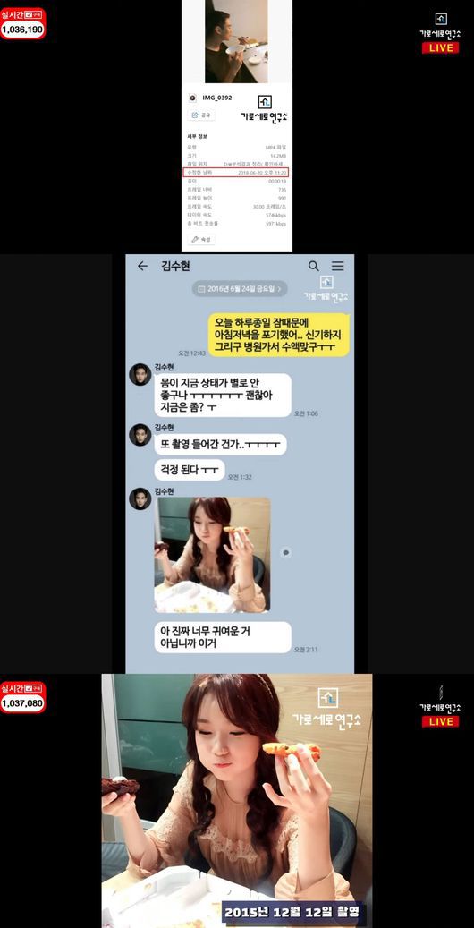 가세연 측은 "김새론 씨가 고2 때 영상이다. 미성년자때 김새론 씨 안 만나고 안 사귀었다고 하지 않았나. 그런데 당신이 군대에서 휴가 나왔는데 밤 11시 20분에 김새론 씨랑 닭도리탕에 소주 먹고. 뭐 했을까. 저희가 이 영상 다음에는 새벽 한시에 김수현이 김새론 씨를 위해 노래 부르는 장면이 나온다"라고 예고했다.