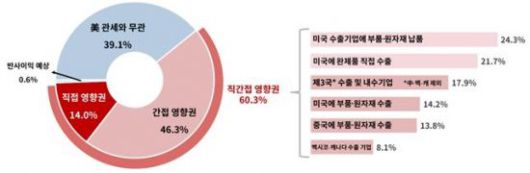 1일 대한상공회의소가 전국 제조업체 2107곳을 상대로 실시한 '미 관세 영향 조사'에 따르면, 국내 제조기업 60.3%가 트럼프 행정부의 관세 정책에 따른 영향권에 놓인 것으로 나타났다. '직접 영향권에 있다'는 응답은 14.0%, '간접 영향권에 있다'고 답한 기업은 46.3%로 집계됐다.