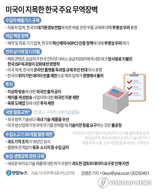 보고서는 한국의 전자 상거래 및 디지털 무역 장벽, 투자 장벽 등도 거론했다.