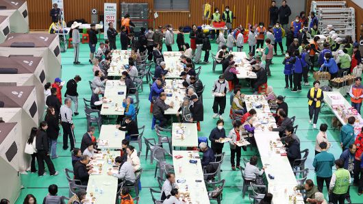 ▲ 30일 경북 청송군 산불 피해 이재민 대피소인 청송국민체육센터에서 이재민들이 점심을 먹고 있다.