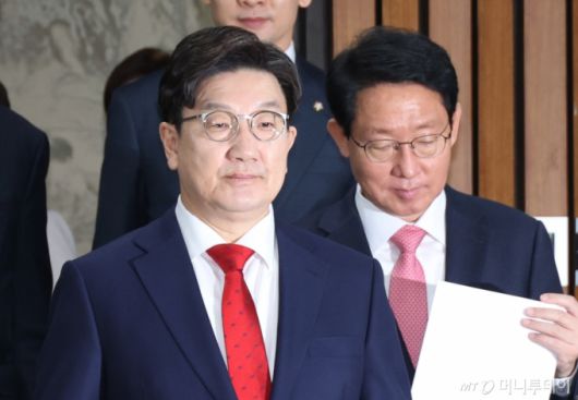 (서울=뉴스1) 이광호 기자 = 권성동 국민의힘 원내대표와 김상훈 정책위의장이 1일 오전 서울 여의도 국회에서 열린 원내대책회의에 참석하고 있다. 2025.4.1/뉴스1 Copyright (C) 뉴스1. All rights reserved. 무단 전재 및 재배포, AI학습 이용 금지. /사진=(서울=뉴스1) 이광호 기자 |