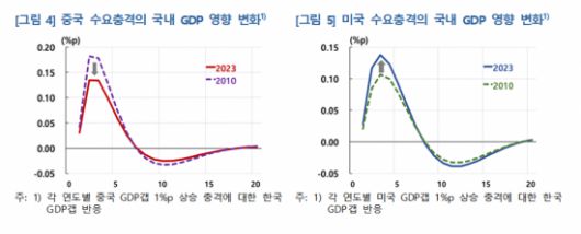 중국 수요충격의 영향은 2010년 대비 2023년 다소 줄어든 반면, 미국 수요충격의 영향은 확대됐다. 윤혁진 한은 금융모형팀 조사역은 이에 대해 "2010년대 후반 들어 글로벌 교역 분절화 움직임과 미·중 무역 갈등 등의 영향으로 중국의 우리 경제에 대한 영향력이 다소 줄어든 반면 대미 수출은 더 많이 늘어난 점이 반영된 결과"라고 분석했다.