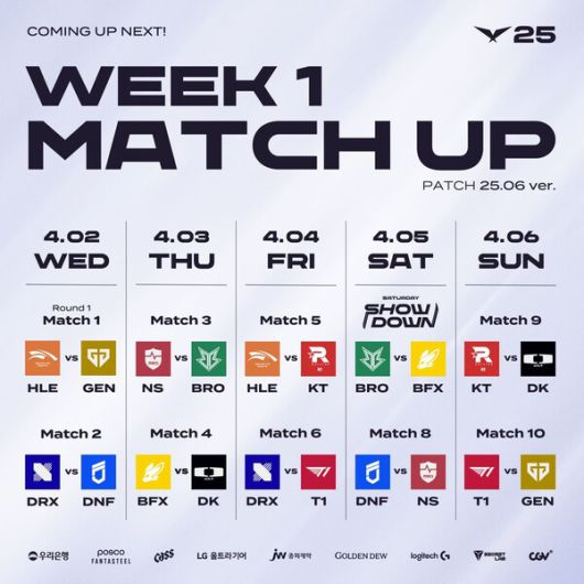 매주 수요일부터 일요일까지 진행되는 2025 LCK 정규 시즌 1경기는 오후 5시에 시작하며, 2경기는 오후 7시에 시작한다. 주말의 경우 1경기는 오후 3시, 2경기는 오후 5시다.