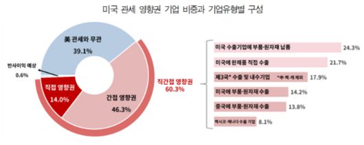 영향권에 속한 기업들은 '미국 수출기업에 부품 및 원자재를 납품하는 기업'(24.3%)과 '미국에 완제품 수출하는 기업'(21.7%)이 많았다.