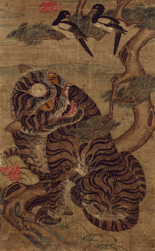 19세기에 그려진 호작도. 구름 사이 떠오른 붉은 태양 아래 거대한 호랑이가 노송 위에 앉은 까치를 노려본다. 화려한 호피 무늬와 노랗게 번쩍이는 눈, 이마에서 빛나는 백호(부처의 두 눈썹 사이에 있는 희고 빛나는 가는 터럭)가 그림 주변의 잡귀를 모두 물리칠 듯하다.