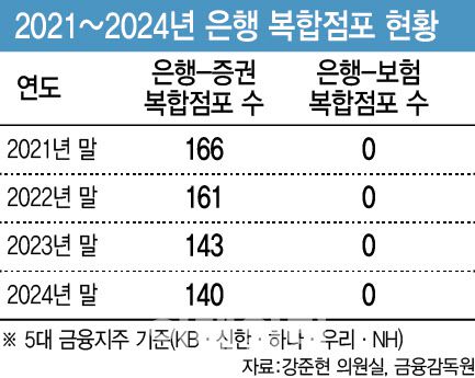 1일 금융감독원이 국회 정무위원회 강주현 더불어민주당 의원실에 제출한 5대 금융지주(KB국민·신한·하나·우리·NH농협)의 복합점포 현황에 따르면 지난 2021년부터 2024년까지 은행·보험 복합점포는 한 곳도 없었다. 지난 2018년 8곳까지 늘었던 은행·보험 복합점포는 수요 감소와 영업점 비용절감 등의 이유로 2021년 이후 자취를 감췄다. 은행·증권 복합점포는 은행의 영업점 폐쇄 추세에도 활성화돼 있다. 5대 금융지주 은행·증권 복합점포 수는 지난해 말 기준 140개로 집계됐다. 2021년 말 166개에서 2022년 말 161개, 2023년 말 143개로 각각 집계됐다. 2021년부터 2024년까지 총 749개의 5대 은행 점포가 사라진 것을 고려할 때 오히려 은행·증권 복합점포는 굳건히 자리를 지키고 있다.