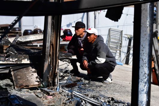 인도네시아 국적의 수기안토(오른쪽)씨가 지난달 31일 산불 피해를 입은 경북 영덕군 축산면 경정 3리에서 당시 급박했던 순간 등을 설명하고 있다. /뉴스1 |
