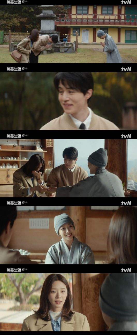 1일 방송된 tvN 새 월화드라마 '이혼보험' 2회에서는 노기준(이동욱 분)이 강한들(이주빈)을 데리고 스님(조보아)을 찾아간 모습이 그려졌다.
