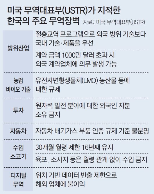 미국은 소고기 수입 제한도 문제로 꼽았다. 한국이 30개월 미만 소고기만 수입하는 조치를 16년째 유지하고 있고, 육포 등 가공 소고기는 아예 수입을 금지하고 있다고 지적했다. 농업 바이오 기술 관련 규제 시스템도 언급됐다. 한국의 신기술 기반 농산물 승인 절차가 복잡해 미국산 농산물 수출에 방해가 된다는 이유다.