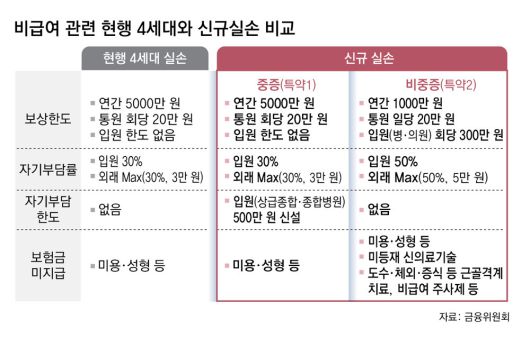 ‘중증 비급여’에 대해서는 한도·자기부담 등 현행 보장을 유지한다. 중증 치료인 만큼 사회안전망 기능을 할 수 있도록 두자는 취지다. 중증 질환은 암, 뇌혈관·심장질환, 희귀난치성질환, 중증화상·외상 등 건강보험 산정특례 대상 질환을 뜻한다. 또 상급종합·종합병원 입원 시 연간 자기부담 한도(500만 원)를 신설해 현행 실손보험보다 중증에 대한 보장을 강화했다.