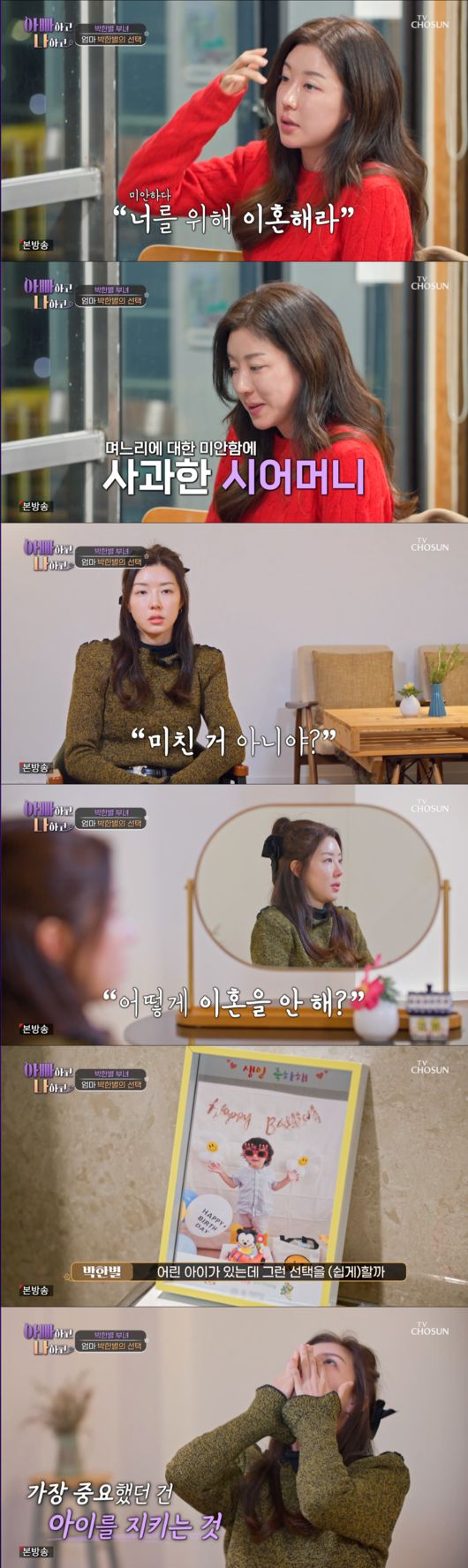 1일 오후 방송된 TV조선 ‘아빠하고 나하고’에서는 연예계 활동을 중단했던 배우 박한별이 가족에게도 말하지 못한 지난 6년간의 이야기이 공개됐다.