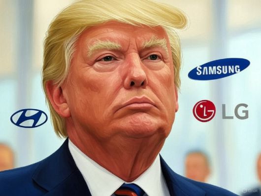 도널드 트럼프 미국 대통령 뒤로 현대차와 LG전자, 삼성전자 로고가 있다.(사진=그록3 이미지 생성) |