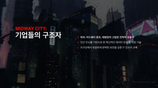 이런 혼란에서 벗어나기 위해 정부와 기업은 태평양의 한 섬에 전략적 요충지를 만들었다. 그리고 그들은 인간의 두뇌를 기반으로 한 데이터 전송 및 저장 기술을 개발해 냈다. 지구상에서 유일하게 완벽한 보안을 갖춘 IT 인프라가 구축된 것이다. 그곳은 바로 ‘미드웨이 시티’. 플레이어가 게임에서 활약할 무대이기도 한 곳이다.