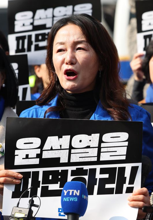 더불어민주당 이재정 의원이 지난달 21일 서울 종로구 헌법재판소 앞에서 열린 민주당 여성위원회 주최 윤석열 대통령 탄핵 촉구 기자회견에 참석해 발언하고 있다. 연합뉴스 |