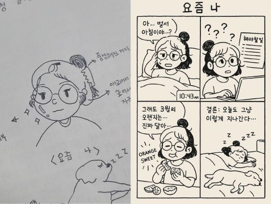 헤럴드경제 독자가 그린 그림(왼쪽)을 바탕으로 4컷 웹툰을 만들어달라고 챗GPT에 입력하자, 챗GPT가 제작한 웹툰. 창작자 그림의 화풍을 그대로 모방해 웹툰을 창작해 준다. [독자 제공] |