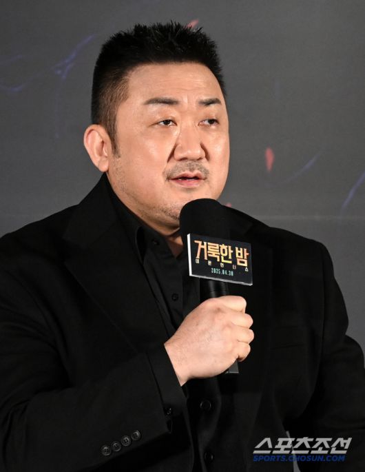 2일 롯데시네마 건대입구에서 열린 영화 '거룩한 밤: 데몬 헌터스'의 제작보고회, 질문에 답하는 마동석의 모습. 허상욱 기자 wook@sportschosun.com/2025.04.02/ |