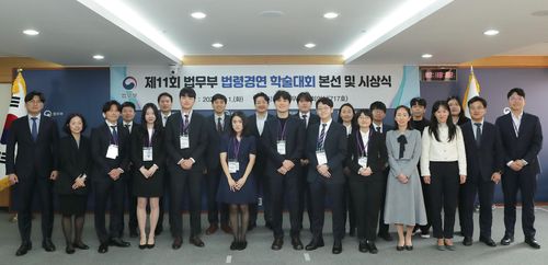 ▲ 법무부는 제11회 법령경연 학술대회 본선 심사 및 시상식을 1일 개최했다고 밝혔다. 이 대회는 매년 전국의 대학생·대학원생으로부터 민법 등 법무부 소관 법령의 제·개정에 관한 참신한 아이디어를 공모하는 행사다. 올해 최우수상은 민법 일부 개정안을 제출한 성균관대팀과 가족관계등록법 일부개정안을 제출한 연세대 법학전문대학원팀이 받았다. (과천=연합뉴스)