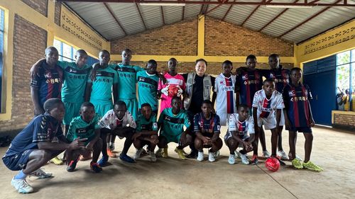 수원FC가 제공한 유니폼과 축구화를 신은 르완다 학생들 |
