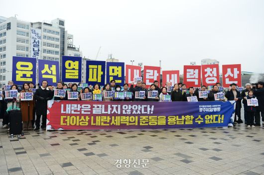 광주지역 180여개 시민단체로 이뤄진 ‘윤석열정권 즉각 퇴진·사회대개혁 광주비상행동’이 광주 동구 5·18민주광장에서 윤 대통령의 파면을 촉구하고 있다. 경향신문 자료사진. |