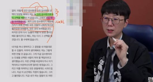 그러면서 "인간 김수현도 우리가 알고 있는 스타 김수현처럼 그렇게 했다면 아무 문제가 없었을거다. 두 개의 삶이 완전히 달랐던 거다. '문제가 될 때는 스타 김수현으로 선택을 한다', 안타까운 거다. 왜 인간 김수현으로서는 그렇게 살지 못한 거냐. 스타 따로 인간 김수현 따로가 어떻게 있을 수 있냐"라며 "스타로서의 김수현의 모습을 보고 평가를 하는데 실제 삶은 그렇지 않았다는 말밖에 안 되는 거지 않냐. 이렇게 글 쓰면 안 된다고 생각한다"라고 지적했다.