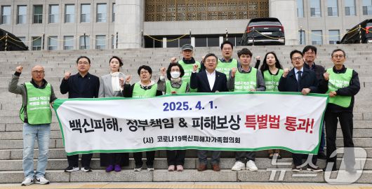 (서울=뉴스1) 김민지 기자 = 코로나19 백신 피해자 유가족들과 더불어민주당 박주민 의원 등이 2일 오후 서울 여의도 국회 본청 앞에서 코로나바이러스감염증-19 예방접종 피해보상 등에 관한 특별법안(대안)이 본회의를 통과한 것에 대해 기뻐하고 있다. 2025.4.2/뉴스1