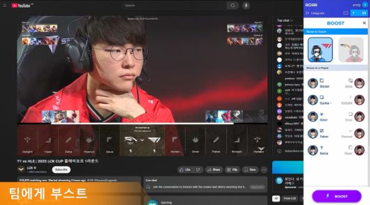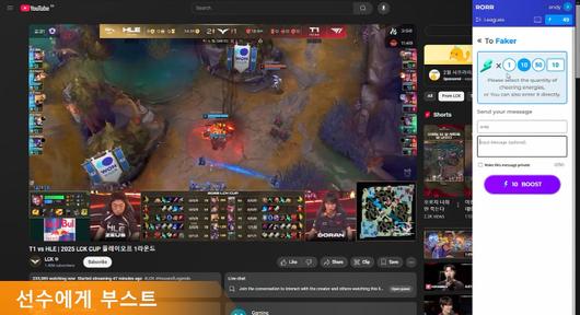 LCK(리그 오브 레전드 챔피언스 코리아) 경기를 보면서 응원하는 팀과 선수의 수퍼 플레이에 실시간으로 기부(도네이션)를 할 수 있는 새로운 개념의 서비스가 나왔다.