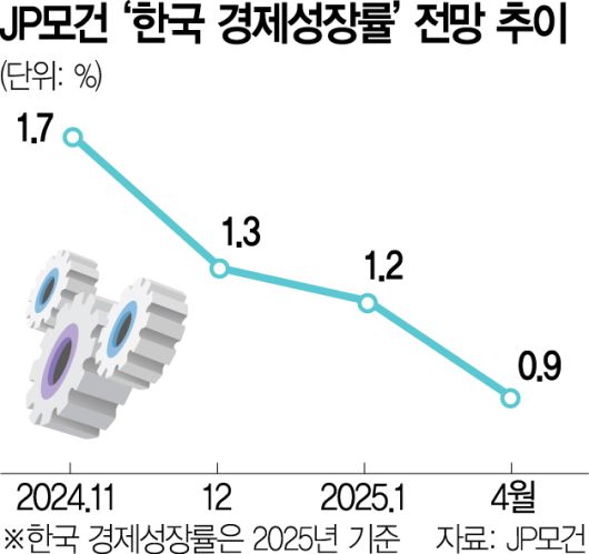 글로벌 투자은행(IB)인 JP모건이 올해 한국 성장률 전망치를 1.2%에서 0.9%로 낮춘 배경에는 미국 관세 부과 조치와 이에 따른 수출 둔화가 자리 잡고 있다. 미국의 상호관세가 우리나라 수출에 직접적으로 악영향을 미쳐 전체 성장률이 낮아질 것이라는 논리다.