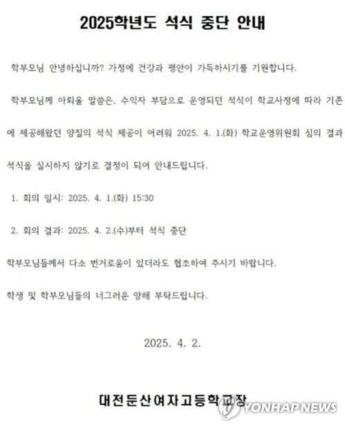이런 가운데 저녁 배식 중단 여파로 둔산여고 학생들의 야간자율학습 취소 신청이 이어지고 있으며, 지역 온라인커뮤니티에서는 학부모들의 불만도 쌓이고 있다.