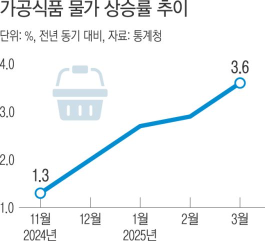 수산물을 제외하면 가장 많이 오른 품목은 가공식품이다. 가공식품 가격은 전년 동월 대비 3.6% 상승해 2023년 12월(4.2%) 이후 1년3개월 만에 가장 많이 올랐다. 커피(8.3%), 빵(6.3%), 김치(15.3%)의 가격 상승폭이 컸다. 이번달에도 라면 등 일부 품목의 출고가격이 오를 예정이다.