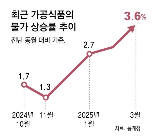 2일 통계청이 발표한 소비자물가 동향에 따르면 지난달 가공식품 물가는 1년 전보다 3.6% 상승했다. 2023년 12월(4.2%) 이후 가장 큰 오름폭이다. 초콜릿(15.5%), 김치(15.3%), 양념소스(11.5%), 커피(8.3%) 등의 가격이 크게 올랐다. 전체 물가 상승률은 2.1%로 3개월 연속 2%대를 이어갔다.