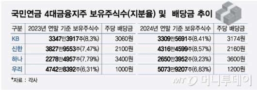 지난해부터 금융지주들이 밸류업 차원에서 배당액을 늘리는 등 주주가치를 높이자 국민연금도 전년 대비 신한금융 489만주, 우리금융 331만주, 하나금융 372만주를 더 사들였다. KB금융의 경우 같은 기간 주식수는 줄었지만 지분율은 8.3%에서 8.41%로 더 늘었다.
