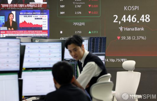 [서울=뉴스핌] 최지환 기자 = 3일 코스피가 전 거래일보다 68.43포인트(2.73%) 내린 2437.43에 개장했다. 코스닥지수는 전 거래일보다 14.10포인트(2.06%) 하락한 670.75에 거래를 시작했다. 달러/원 환율은 전 거래일보다 4.4원 오른 1471.0원에 출발했다. 이날 오전 서울 중구 하나은행 딜링룸에서 딜러들이 업무를 보고 있다. 2025.04.03 choipix16@newspim.com |