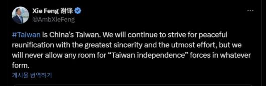 중국 측은 불편한 기색을 내비치고 있다. 셰펑 주미 중국대사는 자신의 소셜미디어에 “대만은 중국의 대만이다”며 “어떤 형태로든 대만 독립 세력에 대한 여지는 결코 허용하지 않을 것”이라고 했다. 이에 반해 중국에 대해 34%의 상호관세를 적용하겠다는 미국의 조치에 대해서는 언급하지 않았다. WSJ은 “트럼프가 연설한 후 셰펑대사는 대만은 중국의 대만이라는 글을 올렸고, 중국 결의를 시험하지 말라고 경고하는 시진핑 주석의 영상 연설을 올렸다”면서 “이에 반해 새로운 관세율에 대해서는 언급하지 않았다”고 지적했다.
